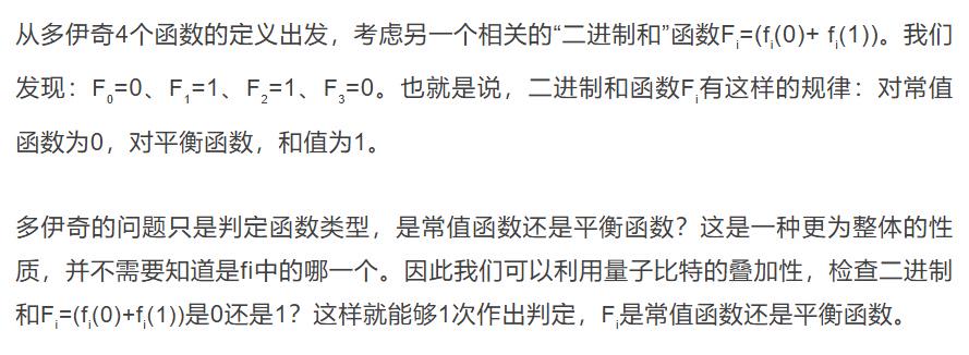 多伊奇提出的问题是:随机给定这四个函数中的一个,我们需要查询多少次,才能确定这个函数是常值函数还是平衡函数?就是说我们不关心给定函数是四个函数中的哪一个,只问它是常值函数还是平衡函数。