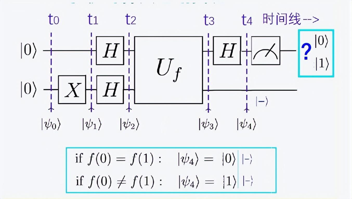持|->不变,测量第1个量子比特,如果结果为0,是常值函数;结果为1,是平衡函数。所以经典计算机要作2次,而用多伊奇算法的量子计算只用1次。