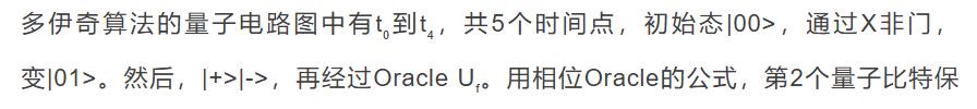 实现多伊奇算法的电路,看起来简单,输入输出皆为2。包括一个Oracle函数门、X非门、H门、最后测量。只测量第一个Qubit,第二个不需要测量。