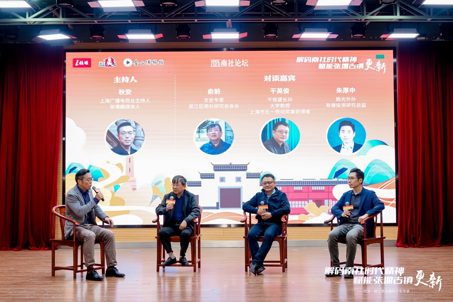 第一场圆桌论坛以《传承南社文脉,赋能新时代张堰古镇发展》为主题,由上海广播电视台主持人、张堰籍媒体人秋安主持,与文史专家、吴江区南社研究会会长俞前,干祖望长孙干英俊,姚光外孙朱厚中等嘉宾,就南社精神如何具体赋能张堰古镇发展进行了深入交流。